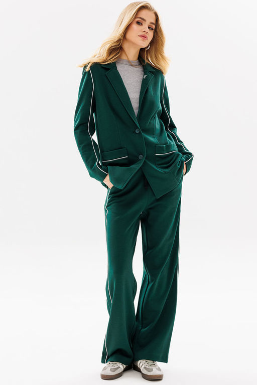 Состав: ПЭ-20%; Хлопок-80%; Костюм в стиле smart casual с контрастными кантами в швах создаст в меру строгий и одновременно расслабленный образ как для работы, так и торжественного мероприятия. Жакет: * классический силуэт и длина * современная форма лацкана и воротника * контрастные канты в швах * контрастная вышивка-логотип на левом лацкане * функциональные карманы Брюки: * классическое облегание и посадка * контрастные канты в боковых швах * удобные боковые карманы * пояс из кашкорсе с резинкой и шнуром внутри Длина жакета по спинке 72-74 см. Длина рукава жакета: 60-62 см для роста 164-170 см, 62-64 см для роста 170-176 см. Полуобхват груди жакета: 42 р - 50 см, 44 р - 52 см, 46 р. - 54 см, 48 р. - 56 см, 50 р. - 58 см, 52 р - 60 см. Длина брюк по боковому шву с поясом: 102-104 см для роста 164-170 см, 105-107 см для роста 170-176 см. Полуобхват бедер брюк: 42 р - 47 см, 44 р - 49 см, 46 р. - 51 см, 48 р. - 53 см, 50 р. - 55 см, 52 р. - 57 см. -- Характеристики -- Состав: ПЭ-20%; Хлопок-80%; Сезон: Осень-Зима Рост: 164 Страна бренда: Беларусь