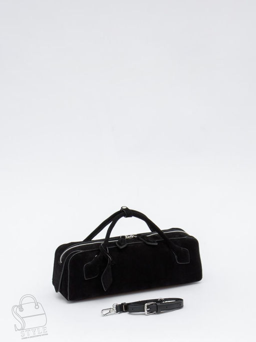 Модель-багет, выполнена из замши. Декорирована брелоком. Дополнена серебристой фурнитурой. Данная модель закрывается на молнию, носится в руке за встроенные ручки или на плече с помощью ремня. В комплекте предусмотрен ремень с регулировкой длины. Каркас полужесткий.