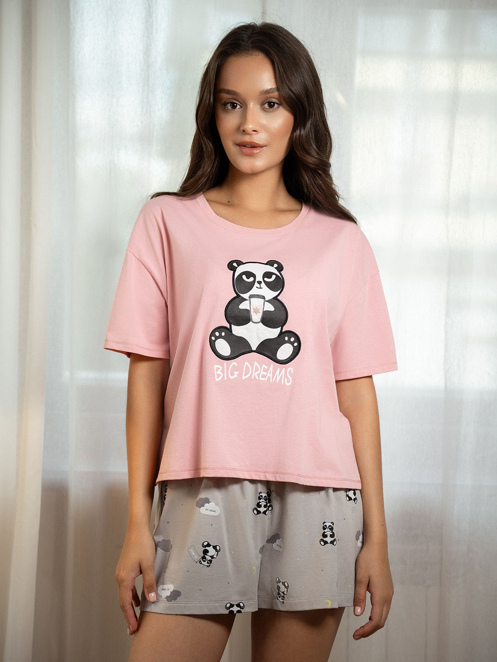 Футболка свободного кроя, с короткими рукавами и круглым вырезом, украшена крупным принтом с изображением панды и надписью "BIG DREAMS".
