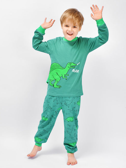 Пижама для мальчика из двух предметов. Кофточка свободного кроя не стесняет движений. Брюки с эластичным поясом и манжетами по низу. Ткань - кулирка мягкая позволяет коже дышать и сохраняет тепло.