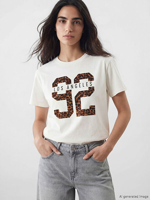• Bisiklet Yaka Los Angeles Bask?l? Kad?n Ti??rt