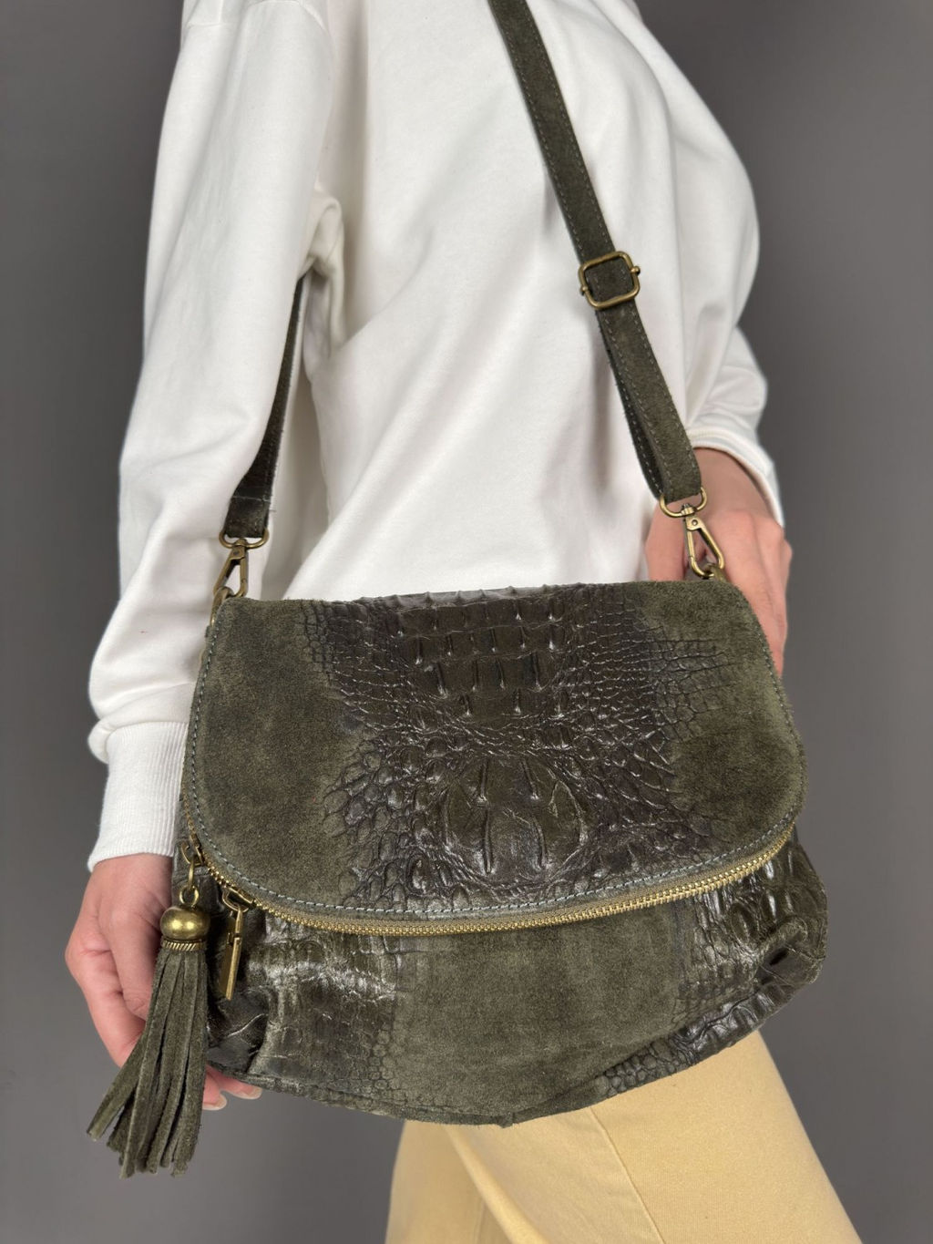 Страна: Италия Акции: Товары со скидкой Производитель: Pelletteria Luisa, Italy Размер: средняя Стиль ношения: на ремешке через плечо Форма: мягкая Выделка кожи: замшевая под крокодила Цвет кожи: Зеленый Оттенок: темно-оливковый Упаковка: Пакет тканевый L, 40x40 см Палитра цветов: TB-39 Caimano Размеры: длина: 30 см \tвысота: 23 см \tширина: 6 см Описание: Красивая и удобная женская сумка из натуральной кожи, производство Италия. Базовая коллекция, ХИТ Sefaro. Шикарная выделка кожи, замшевая с тиснением под крокодила, мягкая форма и оригинальная крупная кисть на молнии придают сумочке вид раритетной и антикварной вещи. Функциональность этой модели на высоте: довольно объемистое при компактных размерах основное отделение уместит все самое необходимое, регулируемый плечевой ремень позволит подобрать комфортную длину. Сама сумочка в целом яркая, эффектная, выполненная в самых разных фактурах кожи и цветовых решениях, как нельзя лучше подойдет энергичной красавице, стремящейся каждый день быть в трех-четырех местах одновременно. Модель сочетается с вещами в стиле Casual, будет органично смотреться в классическом, деловом, винтажном либо повседневном образах. Закрывается внахлест на кнопку и молнию. По периметру крышки двойная молния с декоративной кисточкой из натуральной кожи. Внутри одно большое отделение и два боковых кармана, один на молнии для мелких вещей, другой из натуральной кожи для телефона. С обратной стороны карман на молнии. Качественная итальянская фурнитуре в цвете матовой бронзы. Внутренняя отделка - качественная, водоотталкивающая, приятная на ощупь и долговечная в использовании, ткань. В комплекте имеется кожаный ремешок для ношения через плечо, длиной 120см, регулируется по длине - стильно, удобно и практично!