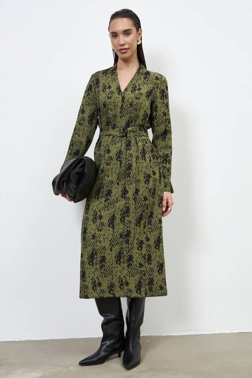 Платье свободного силуэта из плательной ткани. По центру передней части изделия выполнен шов. Цельнокроеная стойка, переходящая в V-образный вырез горловины, визуально делает фигуру стройнее. Втачной длинный рукав с центральным швом и декоративным разрезом по низу рукава. В комплекте пояс из основной ткани.