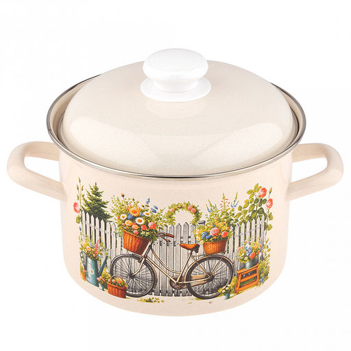 "Романтика" Кастрюля эмалированная 3,0л, форма цилиндрическая, металлическая крышка с пластмассовой ручкой-кнопкой, нержавеющий ободок (Россия)