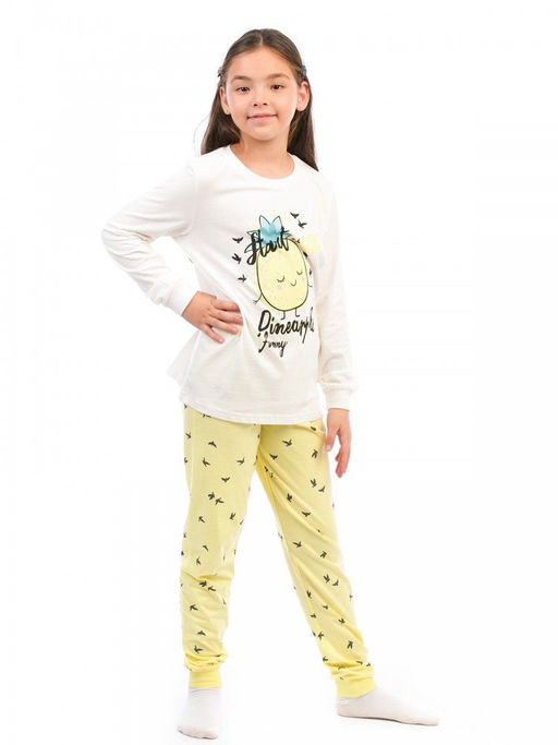 Верх-лонгслив прямого кроя, вырез горловины округлый, рукава с манжетами. Низ-брючки с манжетами, пояс на резинке. Декорировано изделие принтом.­