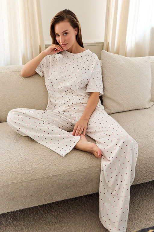 Женская пижама с брюками – это не просто одежда для сна, это кокон уюта, созданный для каждой женщины, ценящей комфорт и стиль в домашней обстановке. Мягкий, словно облако, материал ласкает кожу, даря ощущение безмятежности на всю ночь. Классический силуэт и свободный крой обеспечивают полную свободу движений, позволяя забыть о будничной суете. Широкие штаны с высокой посадкой и эластичным поясом нежно обнимают талию, подчеркивая женственность. Пижама представлена с очаровательным принтом - сердечки, пробуждающими самые теплые чувства и создающими атмосферу нежности. Этот домашний костюм станет настоящей находкой для будущих и молодых мам, а также для юных леди, предпочитающих комфорт и стиль традиционной ночной рубашке. Подарите себе или близким этот островок безмятежности – пижама станет прекрасным подарком для мамы, сестры, дочери или любимой внучки, ведь она – воплощение стиля, комфорта и качества, обещающее самые сладкие и волшебные сны.