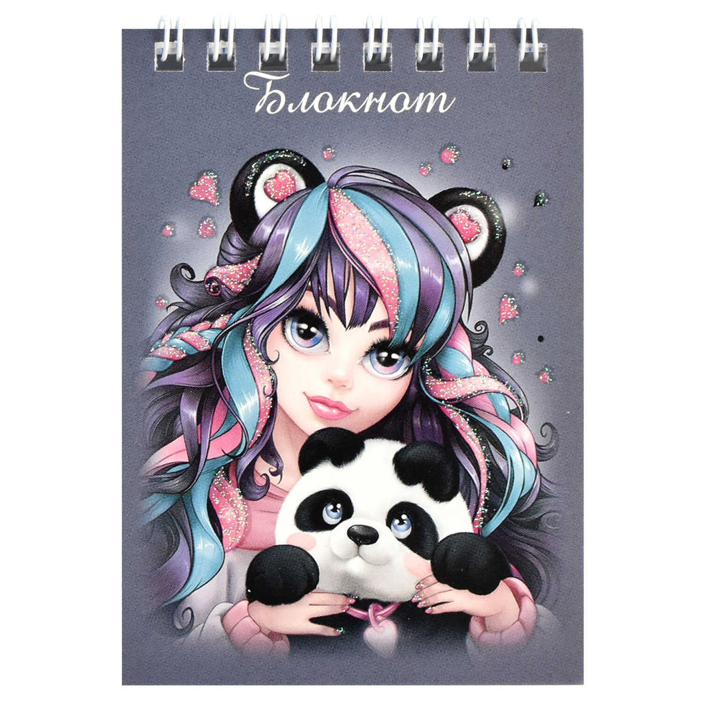 Блокнот, А7, 40 л, арт. 68160 ДЕВУШКА С ПАНДОЙ / Блок - белый офсет 60 г/м?, клетка, гребень по короткой стороне, УФ-лак выборочный с глиттером,