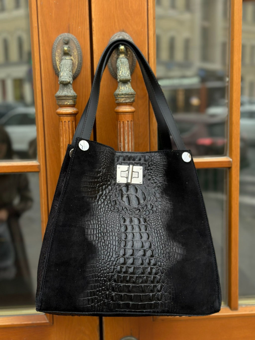Сумочка имеет мягкую форму шоппера, дно укреплено, выполнена из телячьей кожи замшевой выделки с изысканным тиснением под крокодила. В качестве элегантного украшения большая металлическая пряжка и заклепки. Модель универсальна, сочетается с вещами в стиле Casual, будет органично смотреться в классическом, деловом, винтажном, либо повседневном образах.