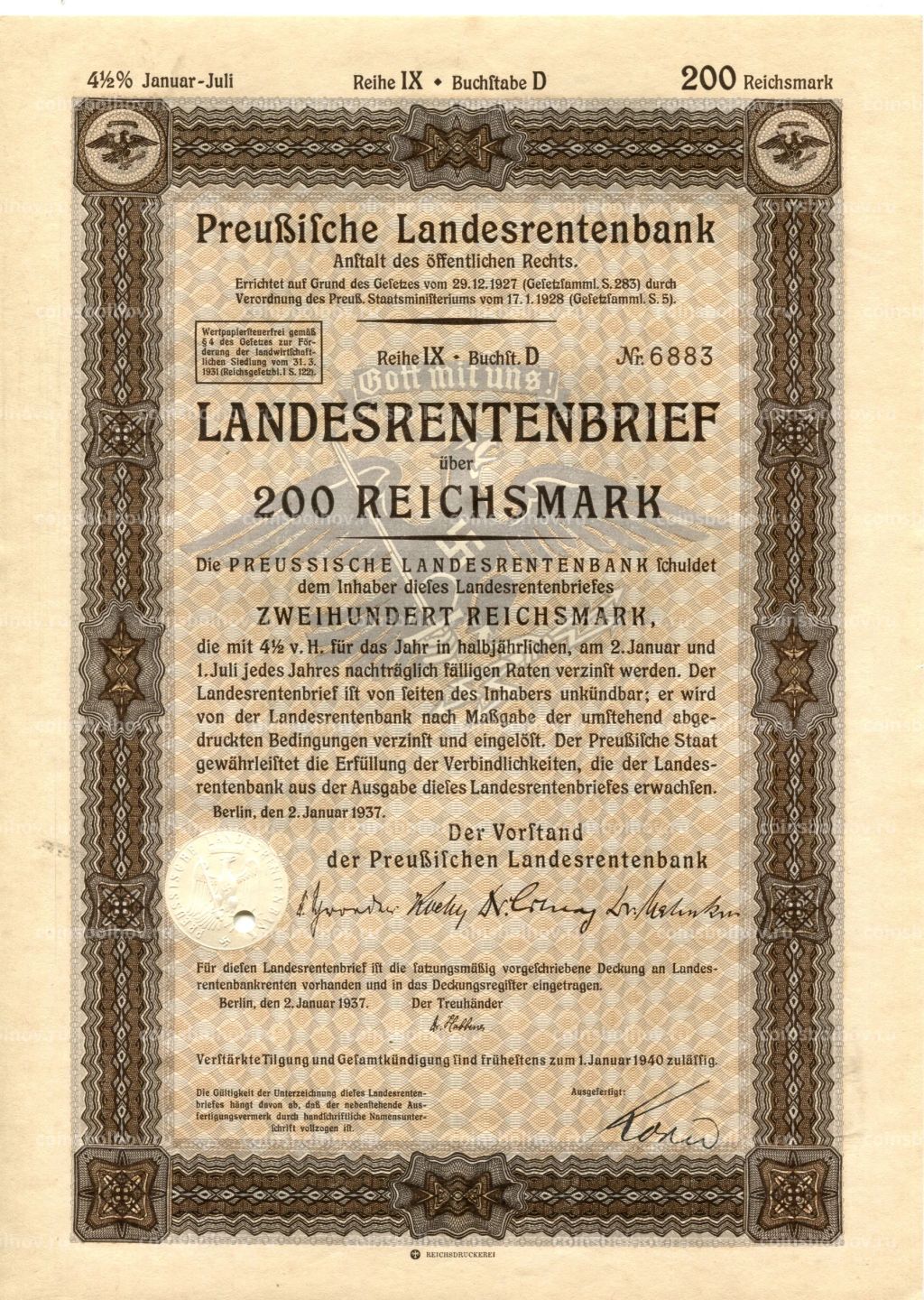 • Облигация 4,5% 200 рейхсмарок 1937 года Германия