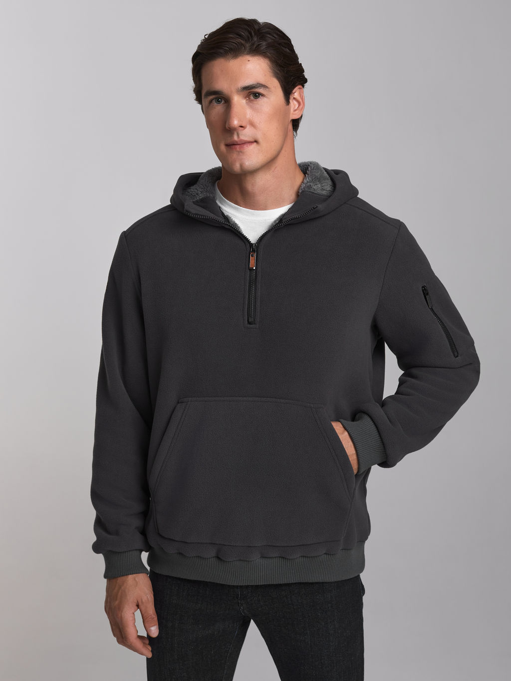 Толстовка мужская из плотного флиса, дублированного мехом. Толстовка с капюшоном с высокой стойкой. Застежка - короткая молния. Карманы "кенгуру", есть дополнительный удобный карман с молнией на рукаве. Низ куртки заужен трикотажным поясом. Рукава втачные, низы рукавов на трикотажном манжете. На правом рукаве шеврон с фирменным логотипом.