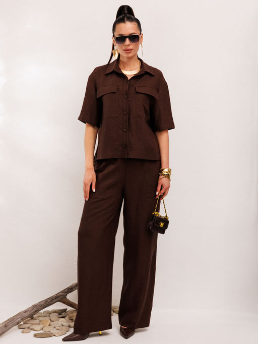 Льняной костюм двойка отличный выбор для женщин которые ценят комфорт и стиль.Этот  комплект состоит из рубашки и брюк, идеально подходит для жарких дней. Рубашка прямого силуэта с воротником стойкой и застёжкой на петли и пуговицы. По переду имеются накладные карманы.