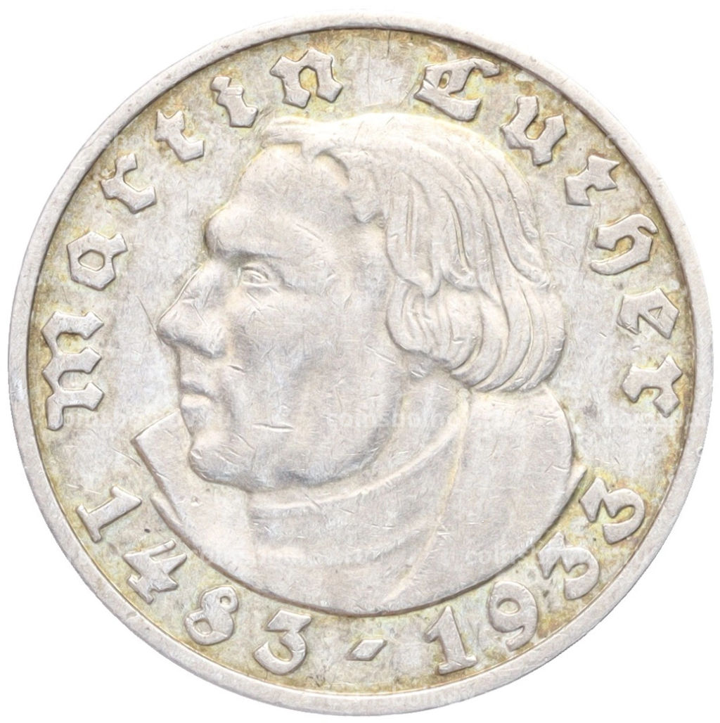 • Монета 5 рейхсмарок 1933 года D Германия 450 лет со дня рождения Мартина Лютера