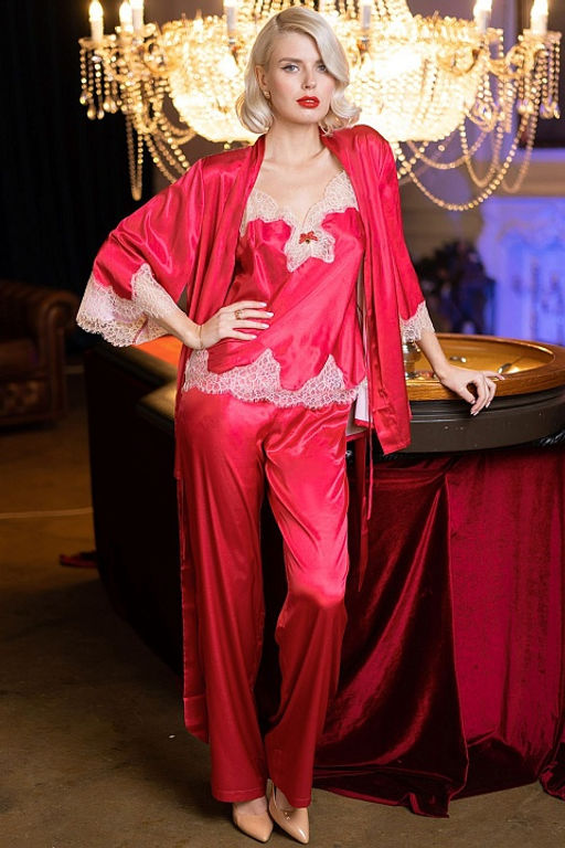 Комплект-тройка Mia-Amore состоит из топа, укороченного кимоно и брюк. Комплект выполнен из искусственного шелка рубинового цвета. Лиф и низ топа, а также рукава кимоно декорированы кружевом. По центру лифа бантик с подвеской. Укороченное кимоно завязывается широким эффектным поясом.­