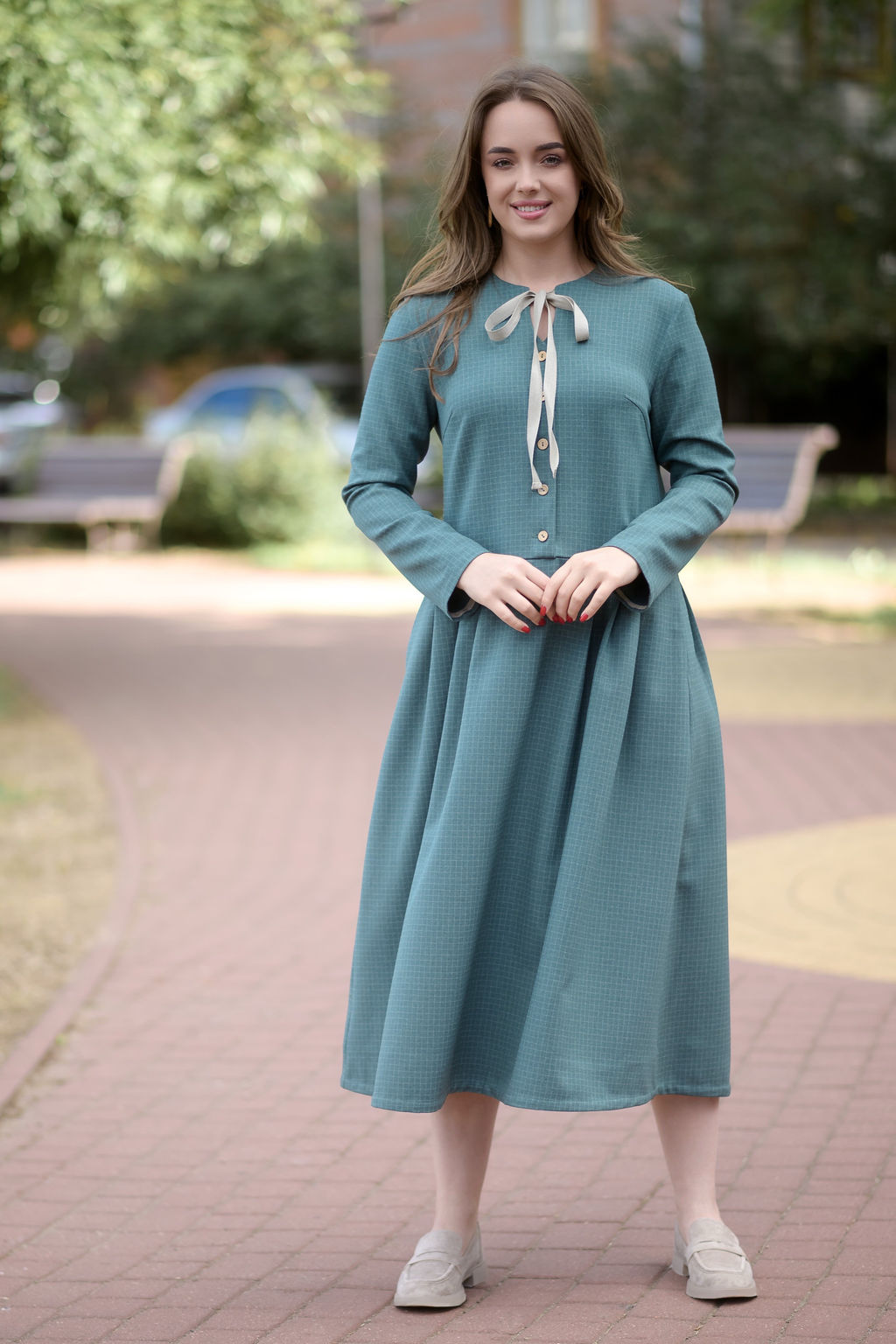 Это платье без сомнения будет уместно как на работе так и на торжественном мероприятии, в храме или на семейных прогулках. Его утончённый силуэт, натуральный состав и продуманные детали подчеркнут особенный вкус и внимание к качеству.
