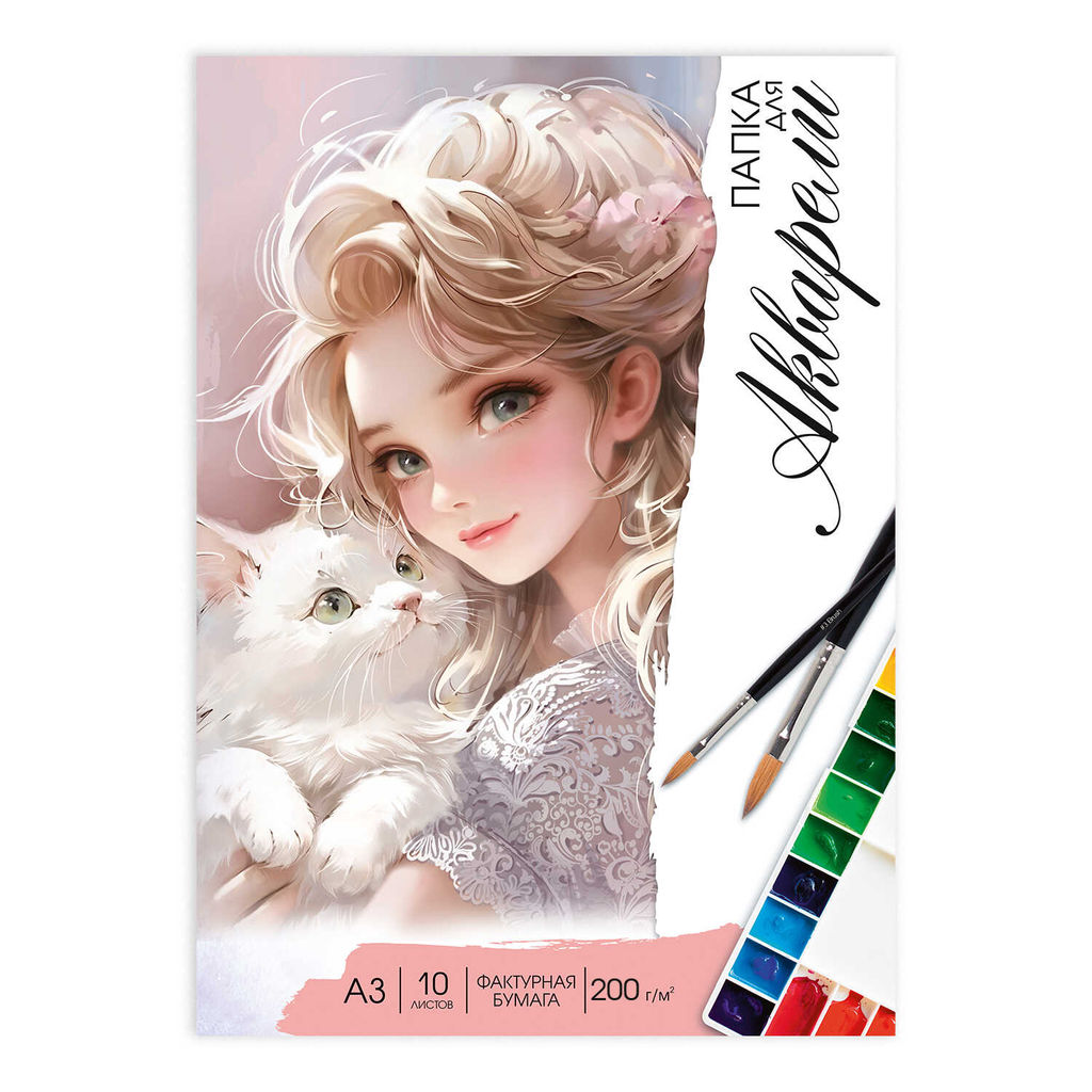 Папка для акварели 10 л, арт. 69931 БЛОНДИНКА С КОТЕНКОМ /А3 блок - белая акварельная бумага 200 г/м?, обложка - полноцветная печать, папка с клапанами/