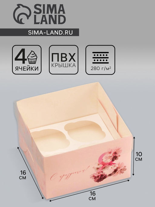 Цена за 5 шт. Коробка для 4 капкейка с прозрачной крышкой, «8 марта», 16×16×10 см