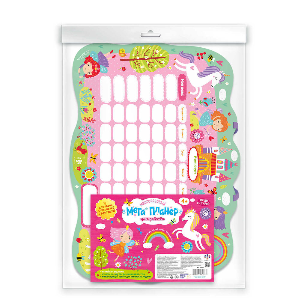 Планер "Мега планер" арт. 53071 ДЛЯ ДЕВОЧКИ /594х420 мм, 1 л., блок - полипропилен, полноцветная печать, обл - мелованная бумага 150 г/м2, фигурная вырубка, атласная лента для размещения на стене, 1 лист с многоразовыми наклейками на прозрачной пленке/