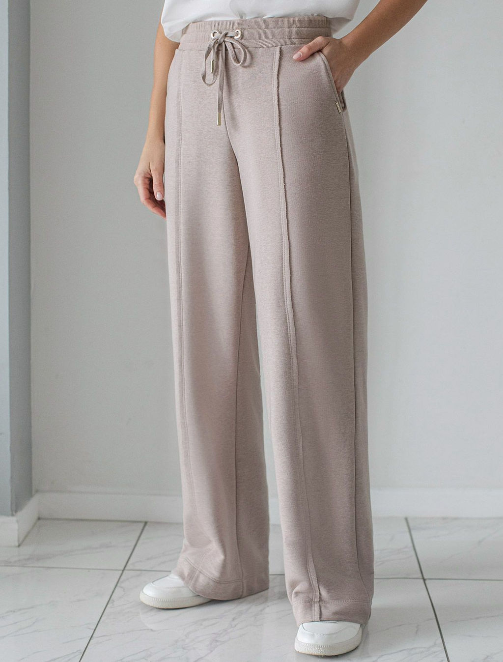 Брюки прямого кроя с удобным эластичным поясом на резинке и карманами по бокам выполнены из премиального футера-двухнитки. Наличие эластана в составе гарантирует комфорт и долговечность изделия, материал хорошо пропускает воздух, позволяя телу дышать.. Эти уютные брюки нежного цвета макиато с эффектом меланж созданы для вашего комфорта. Свободный прямой крой обеспечивает свободу движений и максимальное удобство в любых ситуациях, поэтому они подойдут и на большие размеры, а так же на высокий или низкий рост. Фигура подчеркивается, а силуэт визуально вытягивается за счет кроя палаццо и застроченных декоративных стрелок. Вы можете создать стильный образ на каждый день в сочетании с джемпером D49.139 и бомбером D49.141. В повседневных трикотажных брюках вы будете чувствовать себя комфортно и уверенно, наслаждаясь каждым моментом дня.­