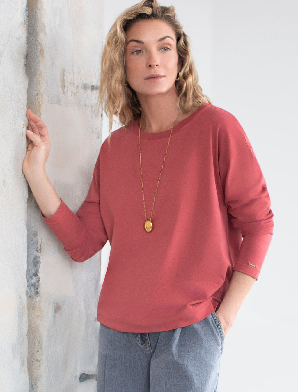 Свободный лонгслив темно-кораллового цвета с длинным рукавом выполнен из премиального хлопка с добавлением эластана, что обеспечивает комфорт и приятные тактильные ощущения. Однотонная расцветка и круглый ворот создают стильный и универсальный образ, который подойдет для повседневного использования. Спущенная линия плеча придает лонгу современный и расслабленный силуэт. Такой лонгслив идеально подходит для весеннего и летнего сезона благодаря легкой и дышащей ткани. Большие размеры позволяют выбрать оптимальный вариант на любую фигуру, обеспечивая свободу движений и удобство на каждый день. Этот комфортный лонгслив станет отличной базой в гардеробе, сочетаясь с различными стилями одежды и создавая простой, но эффектный образ.­