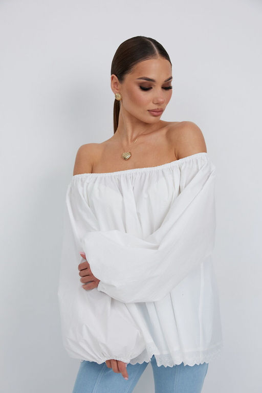 Блузка женская объёмного силуэта, длиной до уровня бедер. Вырез горловины плавной округлой формы, по верху переда, спинки и рукавов резинка. Рукав длинный объёмный. По низу рукава кулиса с резинкой, позволяющая приспустить или поднять рукав выше. Низ блузки обработан хлопковым кружевом.