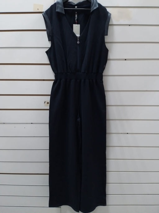 Комбинезон для девочки из комбинированных полотен, полуприлегающего силуэта, с отложным воротником, рукав-крылышко, с V-образным вырезом горловины, отрезной по линии талии. Застежка на молнию спереди. Штанины прямые, длинные. Состав:92% хлопок, 8% лайкра