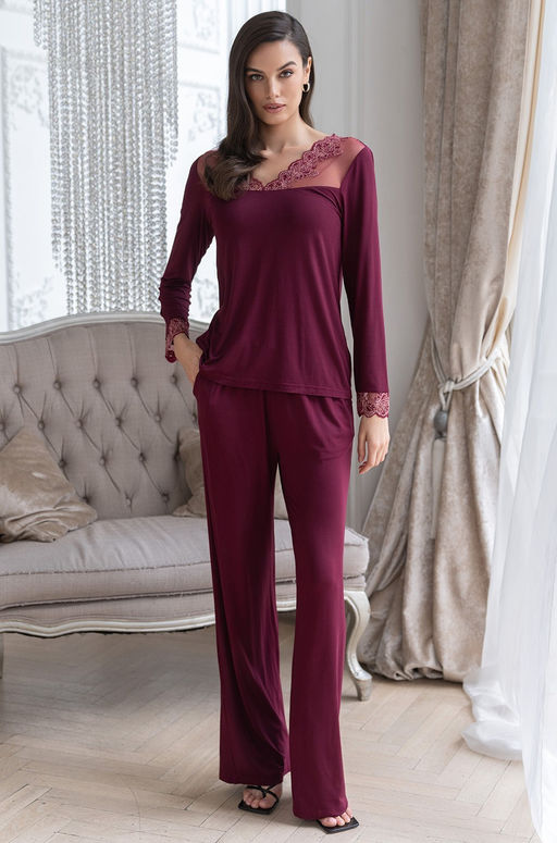 Комплект Mia-Amore состоит из длинных брюк и топа с длинным рукавом, выполнен из трикотажного полотна. По верхней части топа и низу рукавов расположено широкое двухцветное вышивное кружево.