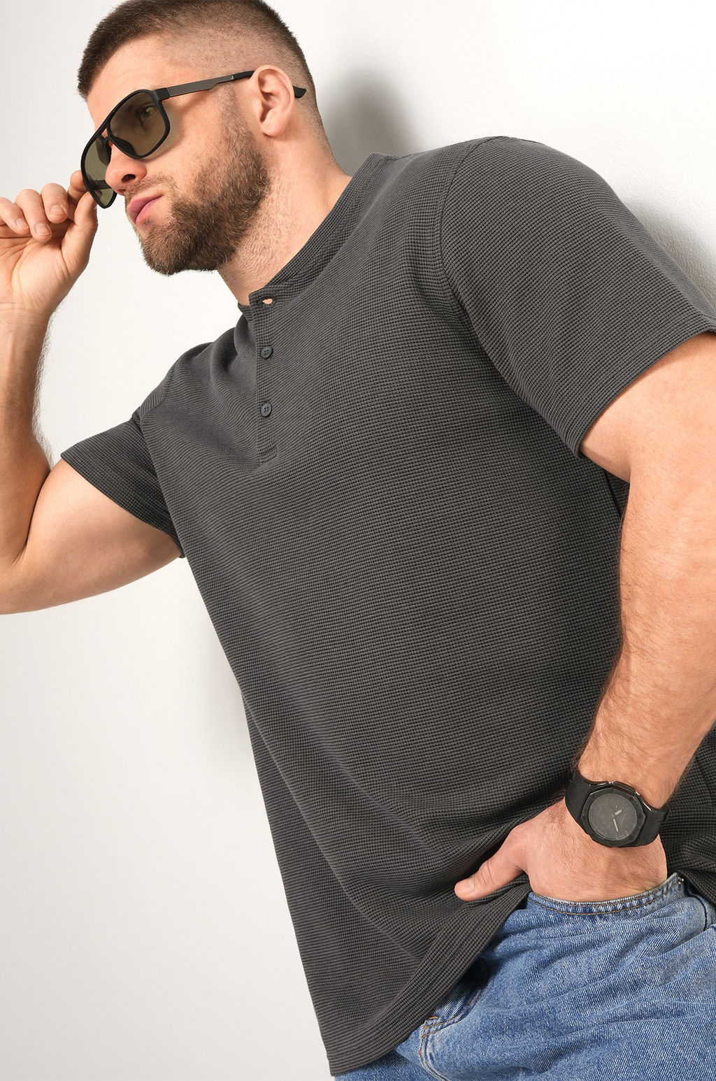 Мужская футболка поло удобная базовая классика! Стильная модель с оригинальным вырезом хенли легко впишется в повседневный гардероб. Графитовый цвет и универсальный крой делают футболку идеальной для офиса и на каждый день.
