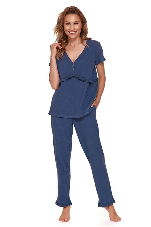 Очаровательная пижама PM.4382 Cosmos выполнена из хлопкового полотна высшего качества, состоит из футболки свободного кроя и прямых брюк с карманами. Футболка с V-образным вырезом горловины и планкой на кнопках. Брюки на мягкой широкой резинке. Пижама декорирована рюшами. Идеальный вариант не только для сна, но и для домашнего отдыха.­