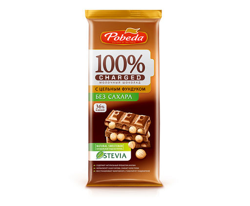Молочный шоколад Чаржед с фундуком и совсем без сахара! Коллекция Чаржед - это шоколад нового поколения, в котором традиционная рецептура разработана с учетом современных тенденций. В уникальной рецептуре кондитерской фабрики Победа вместо сахара добавлена стевия, натуральный заменитель сахара. А нежный и ароматный фундук также природный источник калия, магния, витаминов группы В и глицеридов, способствующих укреплению сосудов.­