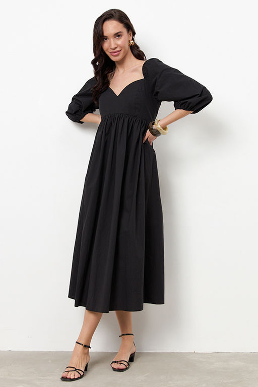 Платье свободного силуэта из хлопковой ткани. Изделие отрезное по линии талии. Линия талия завышена и фигурная. Верхняя часть юбки со сборкой. По среднему шву спинки потайная молния. Лиф переда и спинки двухслойный, имеет рельефные швы. Окат рукава и низ рукава зафиксированы резиной.