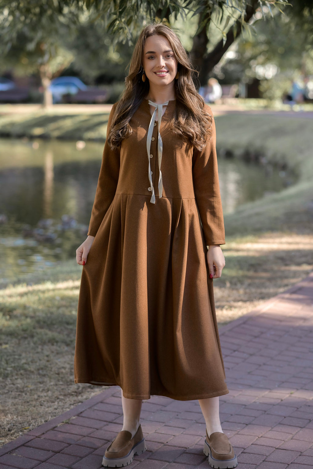Это платье без сомнения будет уместно как на работе так и на торжественном мероприятии, в храме или на семейных прогулках. Его утончённый силуэт, натуральный состав и продуманные детали подчеркнут особенный вкус и внимание к качеству.