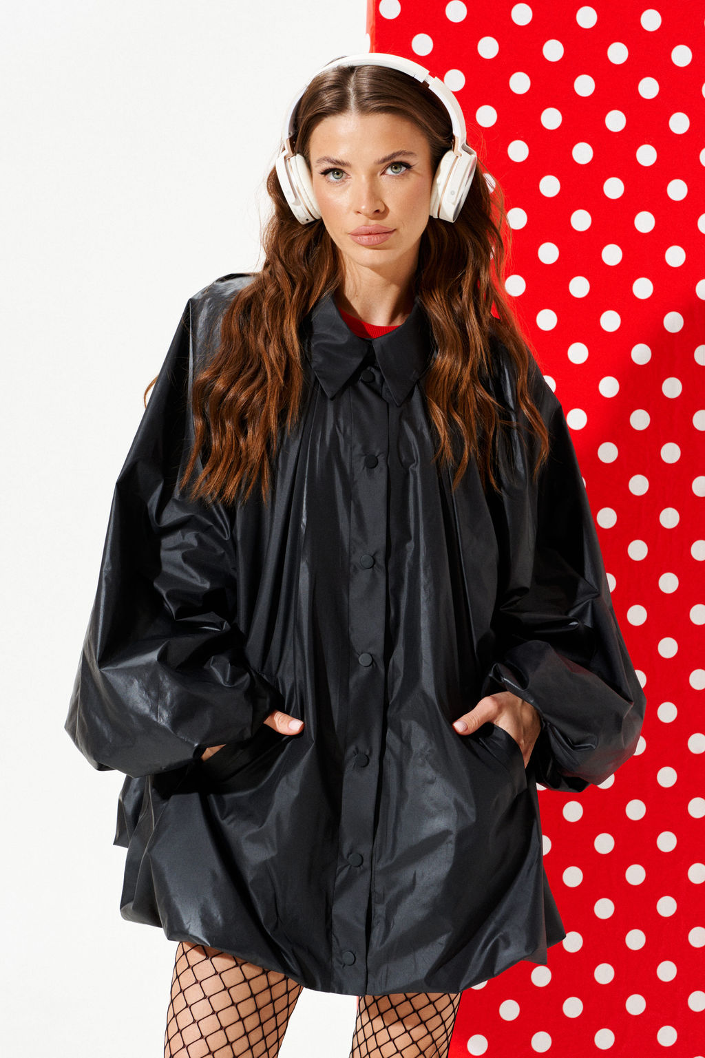 Плащ из курточно-плащевой ткани свободного объема, расширенный к низу, с центральной застежкой на кнопки, отложным воротником, на подкладке. На деталях переда расположены прорезные карманы с листочкой. Спинка цельная. Детали переда, спинка и рукав со встречными складками. Рукав покроя реглан. Нижний срез изделия и рукавов обработан эластичной тесьмой. Состав: 100% ПЭ