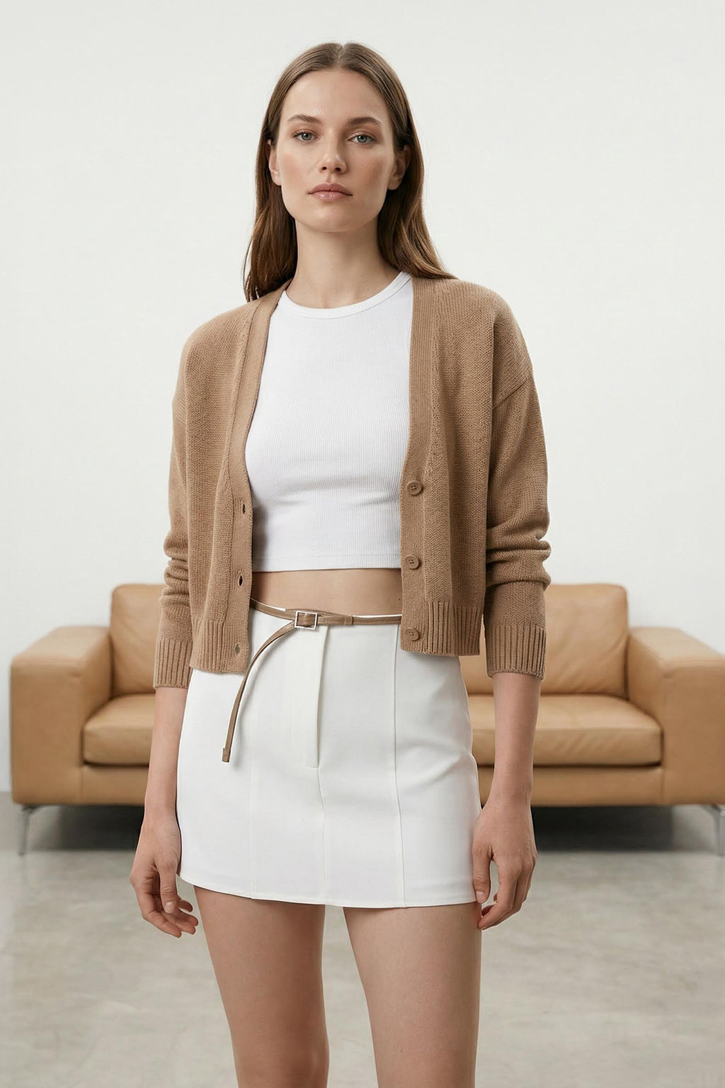 • Beyaz Kemerli Mini Dokuma Etek Gorunumlu Sort TWOAW25SR00027