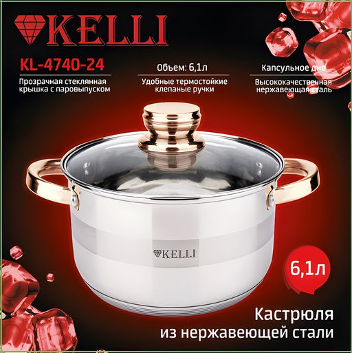 Кастрюля оснащена термостойкими клепаными ручками, которые не нагреваются во время готовки, что обеспечивает безопасность и комфорт при использовании. Это позволяет легко манипулировать кастрюлей, не боясь обжечься. Кроме того, жаропрочная стеклянная крышка с паровыпуском позволяет контролировать процесс приготовления без необходимости открывать кастрюлю, что сохраняет тепло и ароматы внутри. Универсальность KELLI KL-4740-24 также выражается в том, что она совместима со всеми типами плит, включая индукционные, что делает её подходящей для любой кухни.