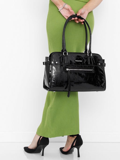 рендовая сумка, выполнена из натуральной кожи. Декорирована ремнями на корпусе. Дополнена серебристой фурнитурой. Данная модель закрывается на молнию Каркас жёсткий. Носится сумка в руке или на плече.  На дне есть ножки.