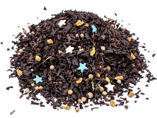 Бленд среднелистового индийского черного чая, кусочков имбиря, семян кориандра и сахарных звездочек. С ароматом рождественской выпечки.