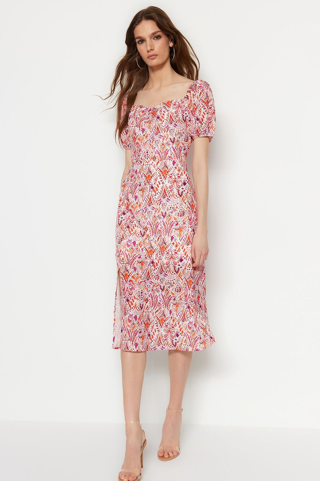 • Pembe Desenli A Kesim Kare Yaka Y?rtmacl? Midi Astarl? Sifon Dokuma Elbise TWOSS23EL01846
