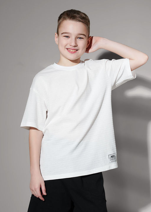 Лёгкая летняя футболка из ажурного трикотажа с воздушным плетением. Свободный крой, круглый вырез. По низу стильная нашивка. Идеально для подростка: комфортно, модно, пропускает воздух. 60%Хлопок40%ПЭ