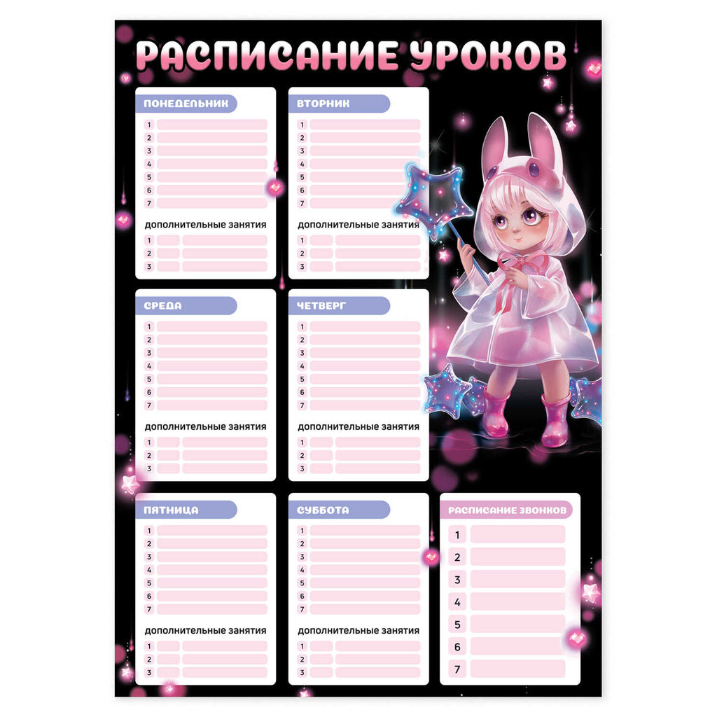 Расписание уроков А3, арт. 68845/ 50 ЛОЛИ И ЗВЕЗДЫ (297х420 мм, материал: мелованный картон 235 г/м?, полноцветная печать, декор: выборочный УФ-лак; цвет: розовый, фиолетовый, чёрный; индивидуальная упаковка: нет)