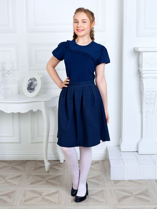 Блузка из эластичного трикотажного полотна.Короткий рукав ,кокетки и " рюш" из шифона с "жаккардовым" рисунком.Застежка на пуговицы.