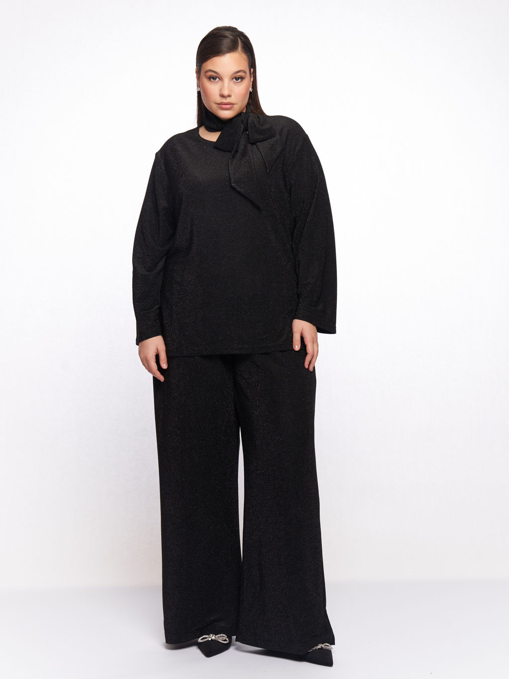 Описание товара Женский брючный костюм больших размеров черного цвета с люрексом