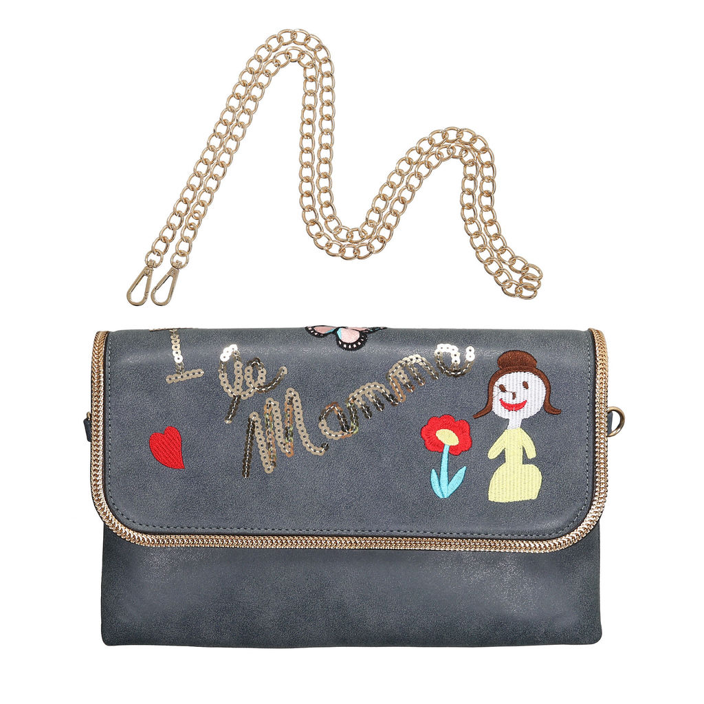Стильный клатч-конверт из искусственной кожи модного синего цвета. Декорирован с лицевой стороны оригинальным рисунком и паетками, край обшит металлической цепью в качестве декоративного элемента. Застежка - кнопка на клапане и молния внутри. В комплекте есть длинная цепочка, которая позволяет носить клатч также и на плече. Внутри одно отделение и один карман на молнии. Размер: 18 * 29 см