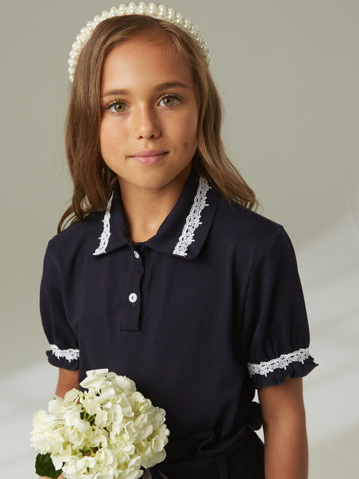 Коллекция школа 2024. Трикотажная Блузка из хлопковой кулирки с дабавлением эластана качества пенье пл.180 гр/м2. Блузка для девочки прямого силуэта с застежкой "поло" и боковыми разрезами с разноуровневым низом для повседневной носки с втачным коротким рукавом. Блузка с отложным воротником и застежкой спереди на пуговицах. Низ рукава собирается на нитку резинку, нижний край с рюшей, поверх рукава и воротника настрочена кружевная тесьма. Низ изделия обработан эластичным швом в подгибку с нижним застилом. Состав:92% хлопок, 8% лайкра