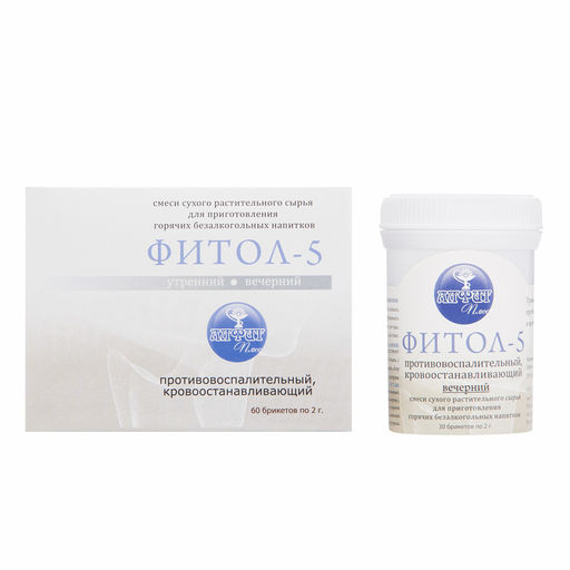 "Фитол-5" утренний: 1 брикет залить 0,5-1 стаканом кипятка. Настаивать 5-10 мин. "Водяной бани" не требуется. Принимать утром по 0,5-1 стакану теплого настоя за 30 мин. до еды. Выпитый осадок усиливает действие.