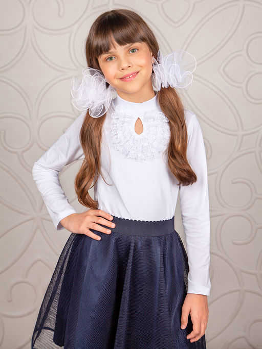 Изделие изготовлено из высококачественного трикотажного полотнаУкрашением служит комбинация с кружевом ,оформленным ввиде "жабо".Рекомендована для школы.­