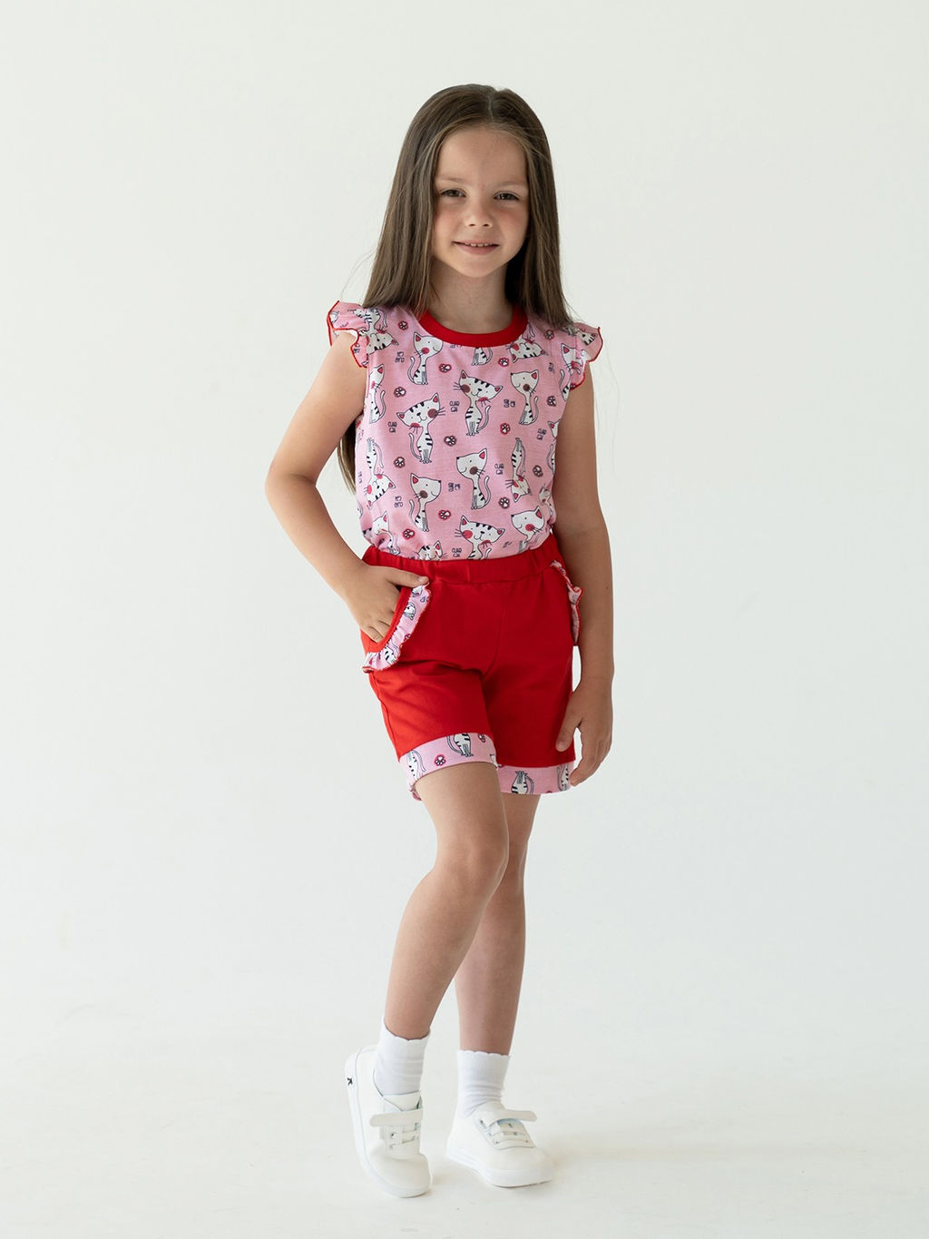 Комплект для девочки из майки и шорт из нежной дышащей хлопковой кулирки. Трикотажная маечка розового цвета с небольшими воланчиками на плечах с милым принтом, который понравится малышке. Шортики свободного кроя однотонного контрастного красного цвета, широкий пояс на резинке, два кармашка. Воланчики на карманах и манжета по низу шорт отделаны сделаны из материала маечки.