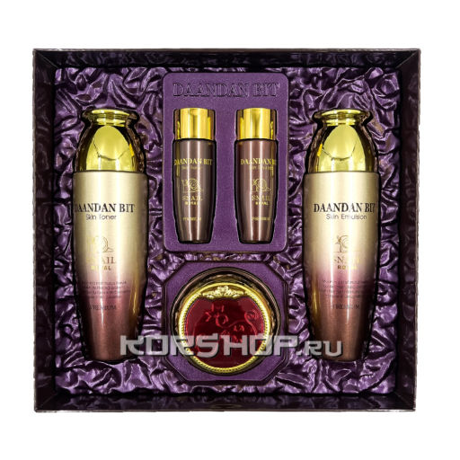 Королевский набор для кожи лица с улиточным муцином и стволовыми клетками подарочное издание от корейской компании Skinnine, которая производит продукцию брендов Jigott и Daandan Bit. В набор входят средства от двух этих брендов, они включают в себя один из новых ингредиентов в косметическом деле улиточный муцин. Муцин это улиточная слизь, которую эти удивительные животные выделяют для облегчения передвижения или же когда они находятся в стрессе. Муцин должен успокоить и защитить улитку, поэтому в нем содержится ряд веществ, положительно влияющих на организм многих живых существ, в том числе и человека.