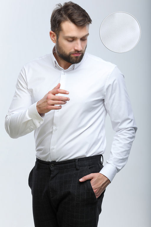 Классическая рубашка прямого кроя с длинным рукавом из однотонной ткани с выработкой бледно-розового цвета , с классическим воротником и манжетом "еврозапонка" (унивесальный манжет). Силуэт Classik fit. Идеальный вариант для свадеб, выпускных и других торжественных мероприятий.