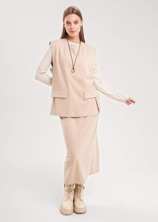 Юбка прямого кроя из трикотажного поливискозного полотна джерси длиной миди. Спереди средний шов, по спинке средний шов с молнией и разрезом. По талии потайная обтачка на резинке, боковые хлястики с пуговицей. По низу изделия потайной стежок.