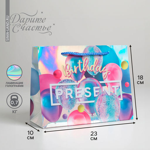 Плотность, г/м²: 190. Допустимый вес вложения, г: 700. Тематика: Надписи, цифры, буквы. Тематика праздника: День рождения. Отделка пакета: Голография. Вид ручки: Ручка-шнур. Особенности: Без особенностей. Бесплатная доставка: Да. Наша разработка: Да. Размеры товара: 10/18/23.
